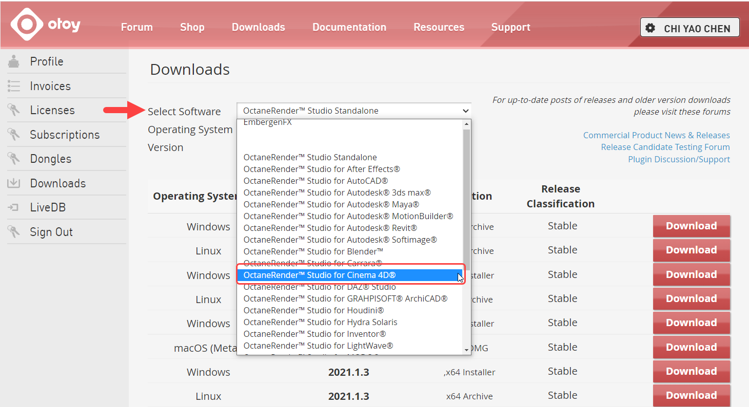 這邊一樣選擇的是 Cinema 4D / Windows / 最新的OC 2021.1.5-R2版本